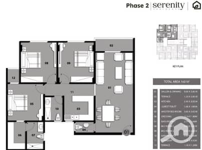 - التقسيم: 3 غرف (منهم ماستر بـ Dressing وحمام وتراس) + ريسبشن واسع + 3 حمامات + مطبخ.