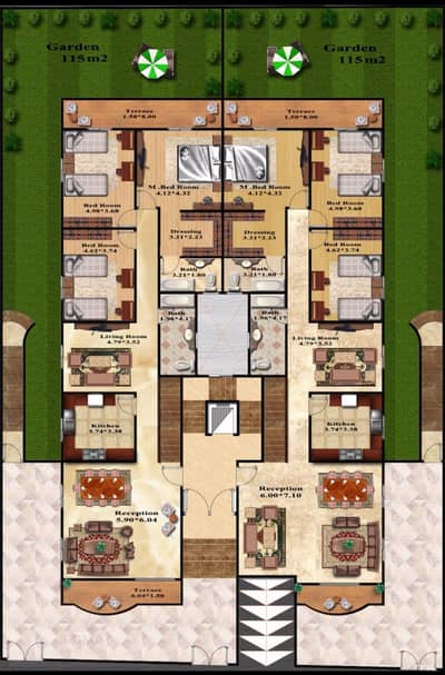 دوبلكس أرضى مرتفع (212 m) و بيزمنت (156 m) مع حديقة (125 m) باجمالي مساحة (493 m) : نص تشطيب