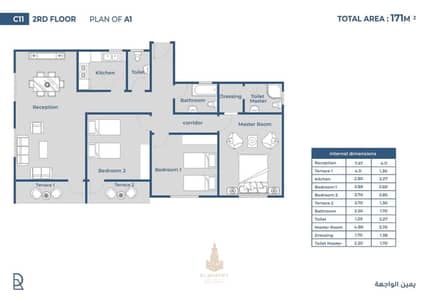 التقسيمة: 3 غرف نوم (منهم غرفة ماستر بدريسنج) + ريسبشن واسع + مطبخ + 3 حمام + 2 تراس.
