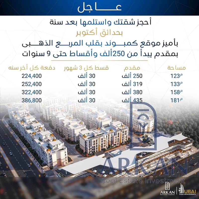MI شقة لقطة في المربع الذهبي بحدائق أكتوبر – مقدم 376,800 ألف فقط بدون دفعات وبدون فوائد واقساط حتي 9 سنين