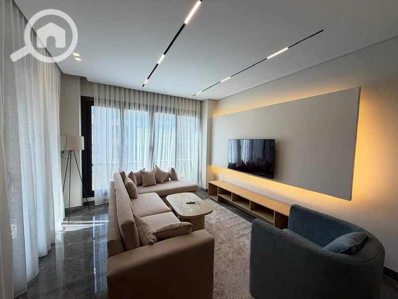 شقة مفروشة للإيجار بأفضل سعر في السوق أول سكن – تشطيب وفرش مودرن برايم لوكيشن داخل كمبوند District 5 – مراكز فرش كامل وأجهزة كهربائية جاهزة للسكن