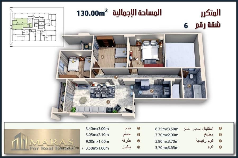 المساحة: 130 متر مربع لكل شقة