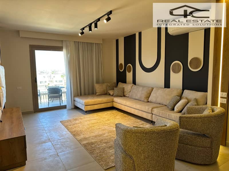 للبيع بمقدم وتكمله اقساط شاليه- Over view the pool تشطيب كامل في هاسيندا باي الساحل الشمالي بتقسيمه مميزه جاهز للمعاينه