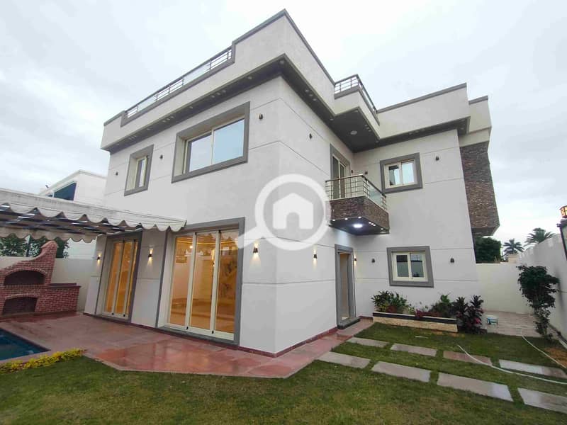 فيلا للبيع مسجلة نهائي في كينج مريوط بالاسكندريه المساحه الكليه 360متر مساحة المباني الدور الارضي 150متر والدور الثاني 150متر والروف 90متر تتكون من دورين وروف و5غرف نوم ماستر ومطبخ طراز امريكي ورسبشن ولفنج وحمام سباحة وشوايه وحديقة وعداد كهرباء و2مياه تشطيب سوبر لوكس كامله المرافق ومسجلة نهائي وقريبا من جميع الخدمات