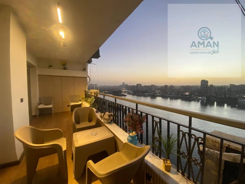 عبارة عن 3غرف و3حمام وريسبشن كبير وتراس 2بلكونة على النيل مباشرة