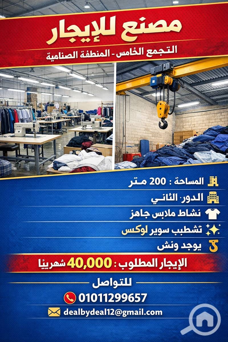 اطلب فيديومصنع للايجار التجمع الخامس الالف مصنع مساحه 200متر نشاط ملابس