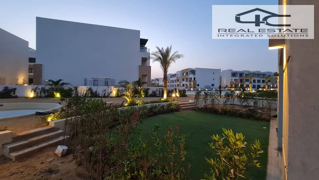 شاليه ارضي بجاردن مفروش بالكامل وتشطيب الترا سوبر لوكس كورنر دايركت على لاجون موقع مميز ريسيل من المالك فى قرية ازها العين السخنة Azha Ain Shokna