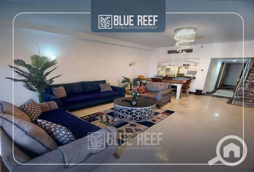 دوبلكس للايجاربالفرش و الاجهزة متشطبة الترا سوبر لوكس غرفتين بموقع مميز جدا في كمبوند بورتو كايرو