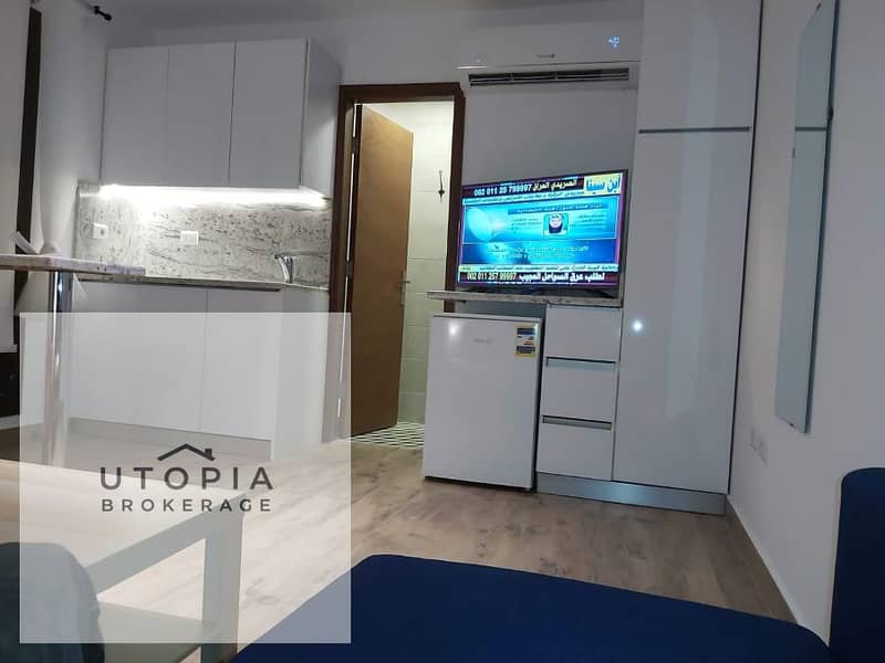 المساحة 25 متر مربع، مجهز بالكامل بأثاث عصري ومطبخ حديث يحتوي على جميع الأجهزة اللازمة (ثلاجة، غسالة، فرن).