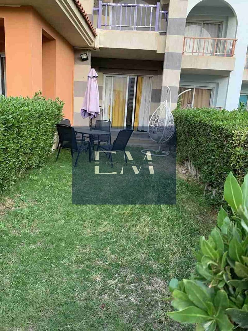 الشاليه يتمتع بموقع استثنائي داخل القرية مع ڤيو مباشرة علي حمام السباحة من الحديقة واللاندسكيب