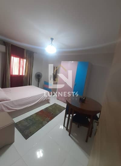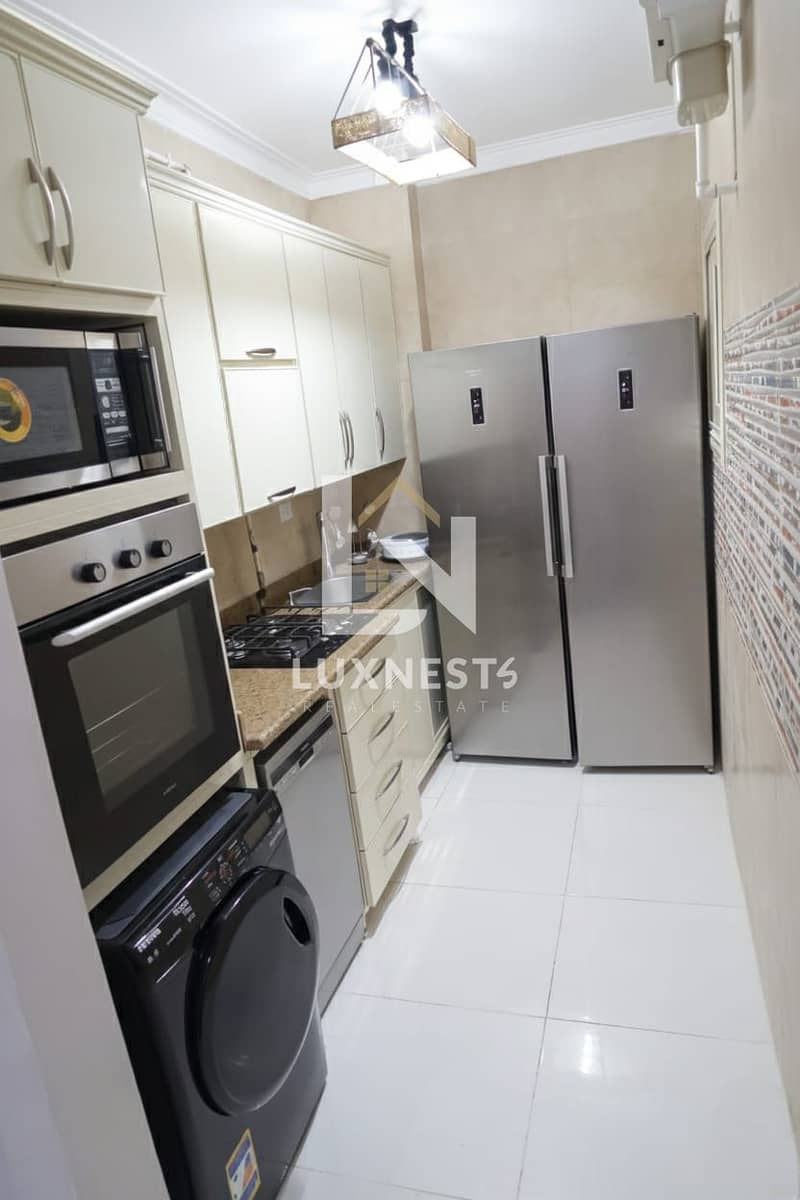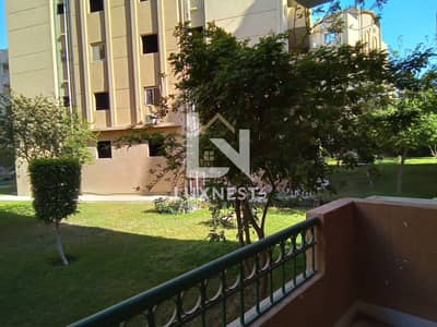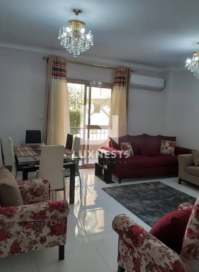 شقة للإيجار في التجمع الأول داخل كمبوند على شارع التسعين، دور أرضي مرتفع بإطلالة على الحديقة، مفروشة بالكامل.