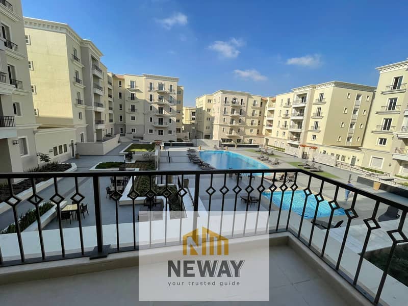 شقة مفروشة للإيجار في ميفيدا بوليفارد 191م² – 3 غرف نوم، 2 حمام – بأطلالة علي المسبح- تشطيب ألترا سوبر لوكس، ، مطبخ مجهز، موقع ممتاز داخل الكمبوند