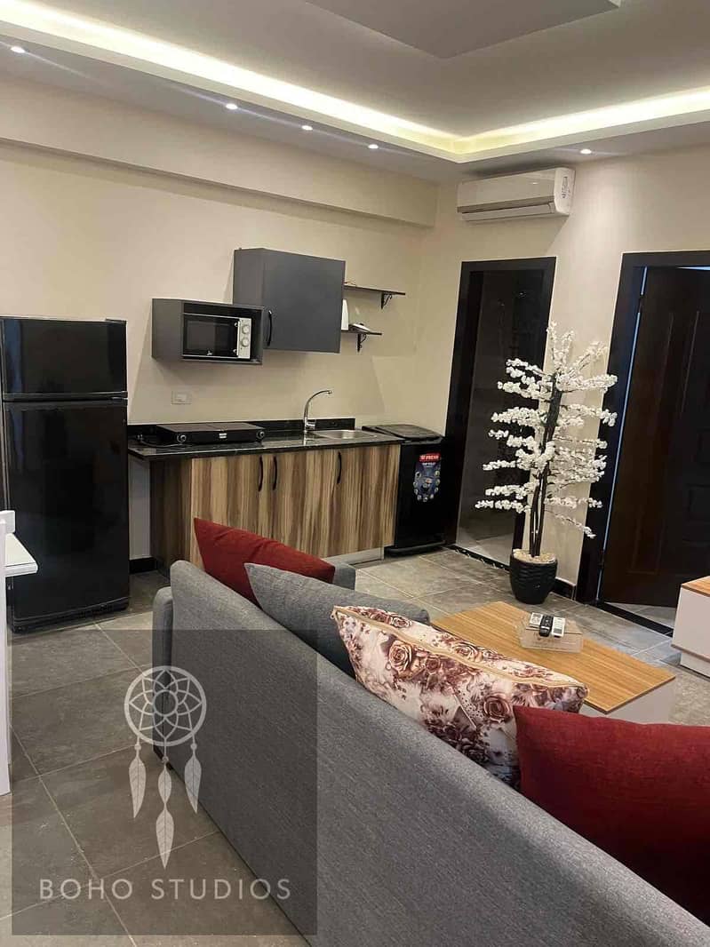 استديو مفروش للايجار في المستثمرين الجنوبي علي شارع الجزيرة رئيسي بالقرب من كمبوند ديار و كونكورد بلز و الخدمات دور أرضي فرش فندقي 80م غرفة نوم +حمام +ريسبشن +مطبخ امريكان مجهز بالكامل السعر 20.000