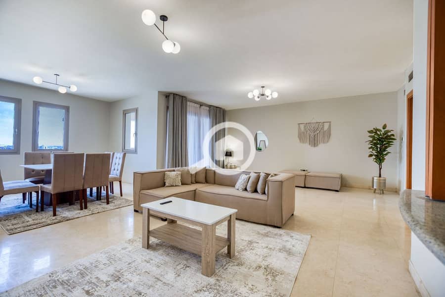 شقة مفروشة بالكامل داخل مرحلة Aurora في كمبوند أب تاون كايرو، تتميز بتصميم راقٍ وموقع استثنائي داخل أحد أرقى مشروعات إعمار بالقاهرة.