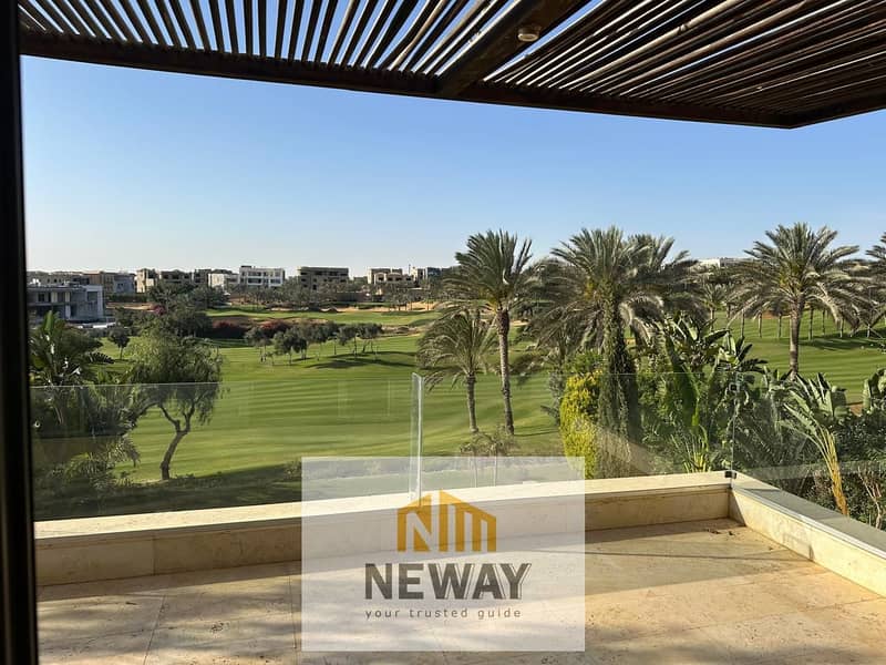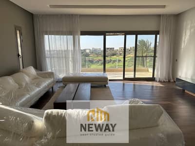 بنتهاوس فاخر للإيجار في قطامية ديونز بموقع متميز بقلب التجمع الخامس بإطلالة جولف وتشطيب هاي إند وفرش كامل -تكييف مركزي