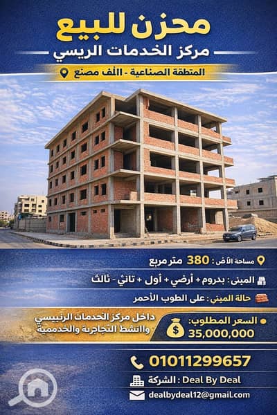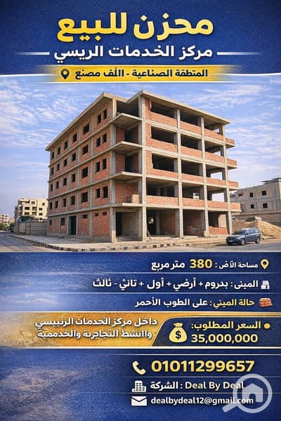 مخزن للبيع مركز خدمات الرئيسى المنطقه الصناعيه الالف مصنع مساحه الأرض ٣٨٠م مبنى بدروم وارضى واول وتانى وثالث على الطوب الأحمر مطلوب ٣٥ مليون
