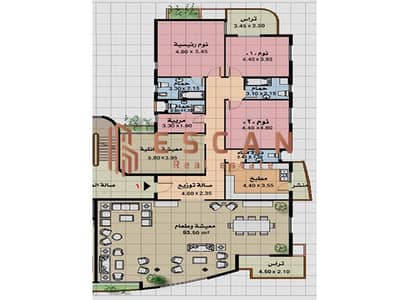 3 غرف نوم + 3 حمام منهم ماستر بدريسنج + غرفه ليفنج كبيره + ريسبشن كبير 100 متر + مطبخ + غرفه ناني ب حمام
