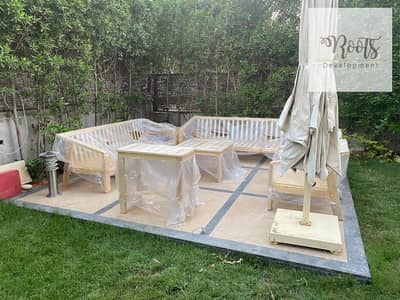 حديقة كبيرة مع جلستين وارضية رخام طبيعي مع نجيلة وشجر طبيعي