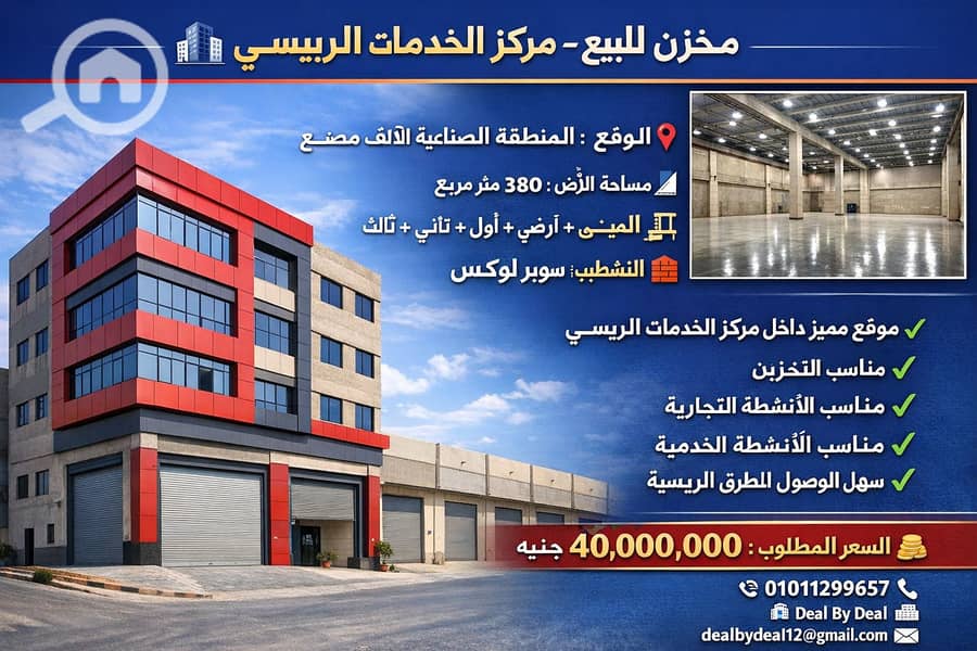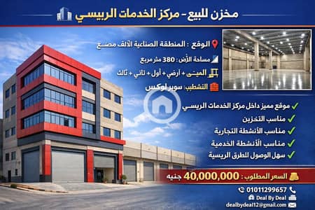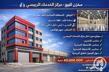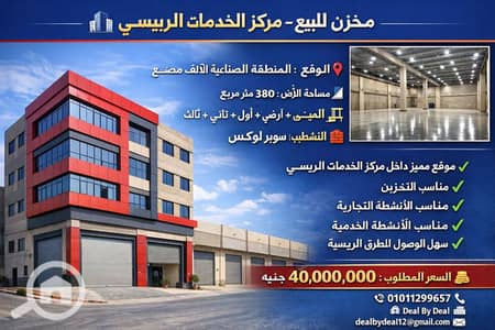 مخزن للبيع – مركز الخدمات الرئيسي الموقع: المنطقة الصناعية الألف مصنع مساحة الأرض: 380 متر مربع المبنى: بدروم + أرضي + أول + ثاني + ثالث