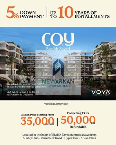 Coy Sheikh Zayed Compound is located just two minutes away from the Z West project. Coy Sheikh Zayed is conveniently located near Arkan Plaza, offering easy access to the 26th of July Axis and Al Wahat Road.