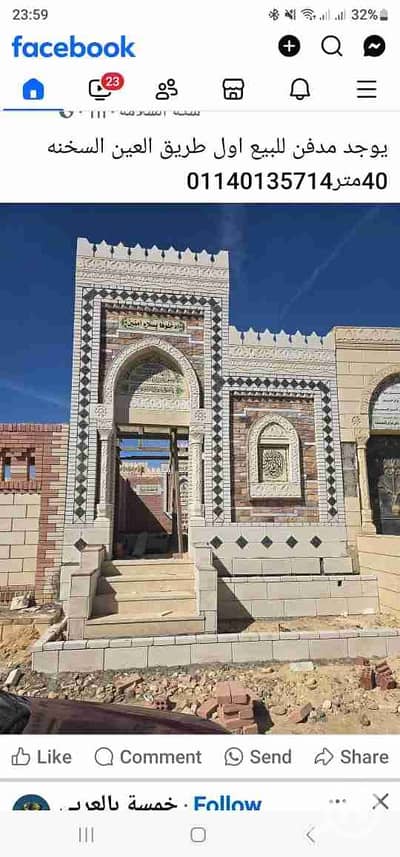 مدفن للبيع مساحه 40 متر مدافن القاهره الجديده أول طريق القطاميه العين السخنه بعد بوابه رسوم القطاميه ب 8 كيلو أمام العاصمة الاداريه مرخص من جهاز مدينه القاهره الجديده هيئة المجتمعات العمرانية كامل البناء والتشطيب استلام فوري تشطيب على التراث الإسلامي موقع مميز جدا سهل الوصول إليه المدفن عبارة عن اتنين عين من الداخل ولهو صور من الطوب الوردي وسلم خارجي رخام باب حديد لضمان خصوصية المدفن وجهات من الحجر الهاشمي والرخام وايات قراني ولدينا مساحة مختلف تبدأ من 21 متر 40 متر 80 متر جميع المدافن مرخصة كامله البناء والتشطيب المعاينة مجانا طوال أيام الأسبوع لمزيد من التفاصيل برجاء الاتصال بنا على الارقام التاليه