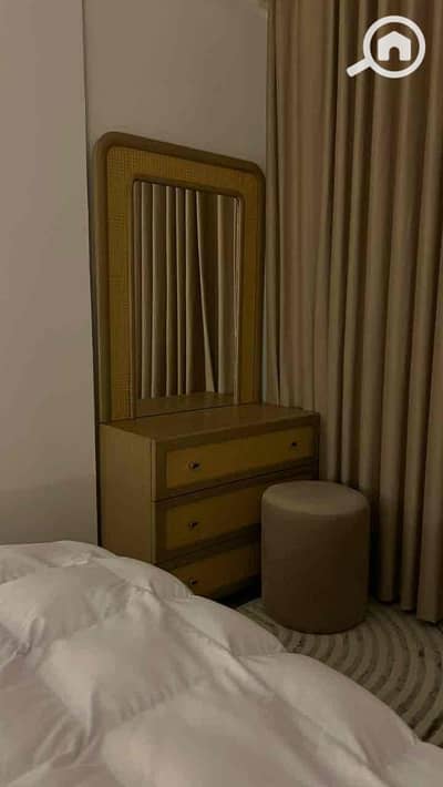 A luxurious hotel apartment consisting of two bedrooms and a bathroom, fully furnished with elegant modern furniture.