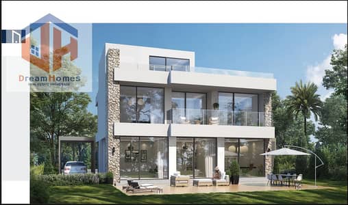 The villa features a prime location next to the club and services, facing north, with a new modern design and an open view of a wide garden.