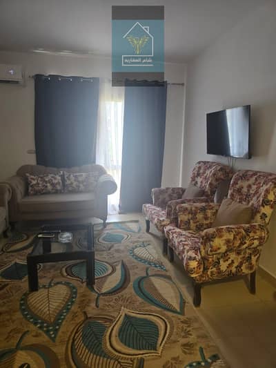 Furnished apartment for annual rent in Sheikh Zayed, District 12, Future Buildings, first floor after the ground, fully air-conditioned, with 2 screens, and overlooking the main street.