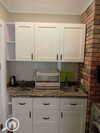 Westown SODIC furnished rental in Sheikh Zayed, 30 sqm with a 100 sqm roof and an elevator up to the roof. The studio is fully furnished and air-conditioned, with a bedroom, reception, kitchenette, and bathroom, and there is internet available.