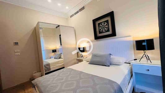 Ground floor hotel studio with a garden in Dream Land Compound, furnished and fully air-conditioned, with a bedroom, kitchenette, reception, bathroom, and garden, and there is internet in Dream Land Compound, 6th of October.