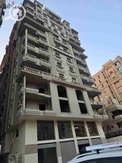 For sale, a tower on Makram Abid main road, a strategic location suitable for all commercial purposes, hospitals, companies, banks, hotels, malls, exhibitions, car dealerships, successful investment, and working men in Nasr City in the golden area, first Makram Abid, with a front view.