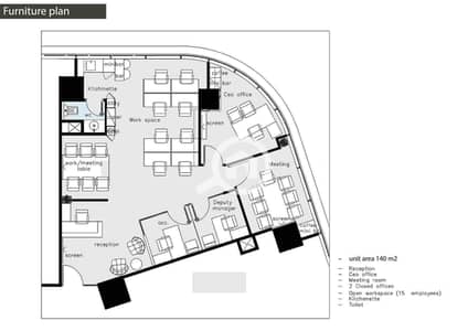 Consisting of a reception area - open work area - CEO room - meeting room - 3 manager rooms - office - toilet.