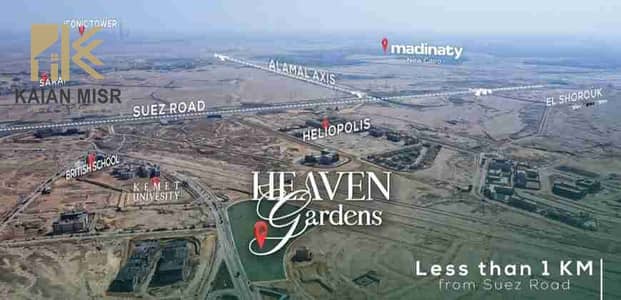 An apartment with an area of 79m + 7m garden in the Heavens Gardens compound on the Cairo-Suez Road.