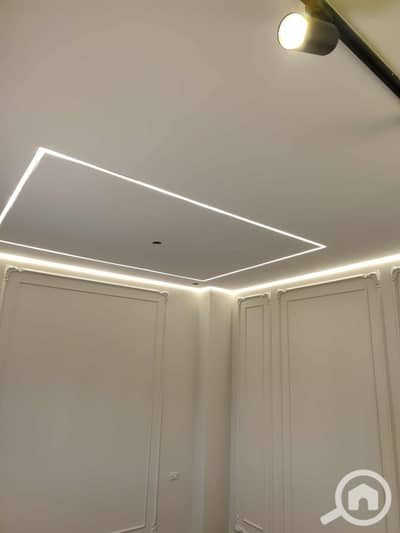 Imported porcelain tile flooring, Al-Gawhara parquet flooring in the bedrooms, gypsum board ceilings, and modern lighting