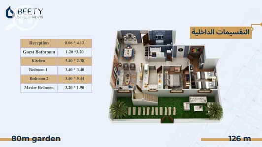 In the best location in Beit Al Watan, 7th District, own a 126m² ground floor apartment with a 40m² private garden, facing north on a main C-shaped st