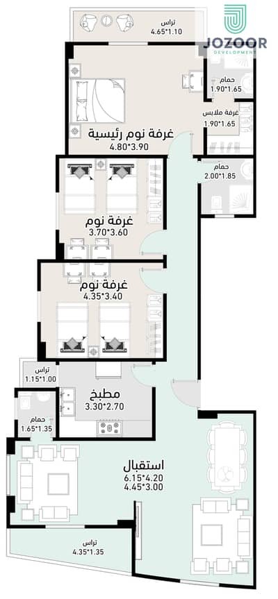 160 sqm apartment with a smart layout: 3 bedrooms, 2 bathrooms, a spacious kitchen, and a large 3-piece reception area.