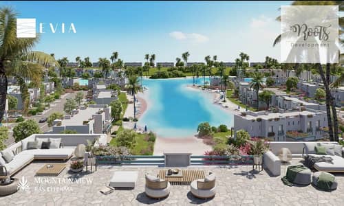 Ground floor chalet with a 100 sqm garden for sale. Fully finished, first row on the sea, on the highest terrace overlooking the entire lagoon in Mountain View Ras El Hekma - Phase (Evia) - North Coast.