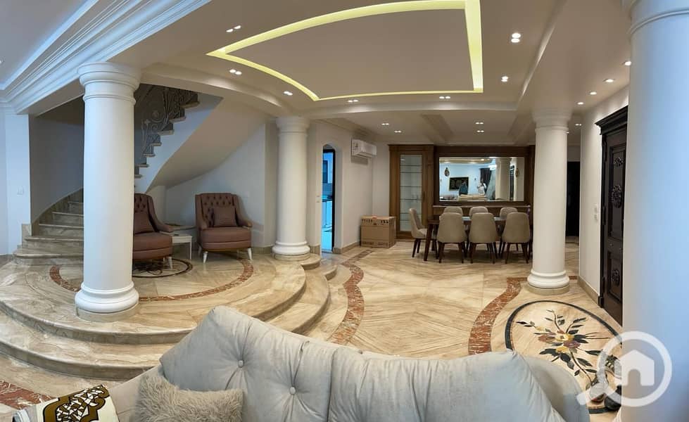3-story villa + roof terrace with a built-up area of 850 sq m and a private garden of 450 sq m — excellent location with an open view overlooking the GUC gardens. The villa has a full sea view.