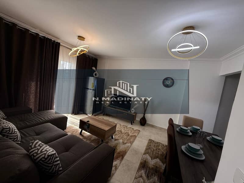 Furnished apartment for rent in Madinaty, 78 sq m, in B12. First occupancy, modern furnishings, fully air-conditioned, very close to amenities.