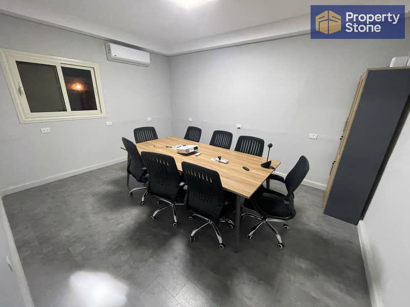5 rooms, including 2 master suites. Large reception area with fully open spaces. Air conditioning. Office. Modern LED lighting. Fiber optic internet. 4 bathrooms. Rent: 150,000 EGP