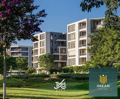 For sale in Taj City Compound, a ready-to-move-in apartment with a view of the landscape and swimming pools in the First Settlement, New Cairo.