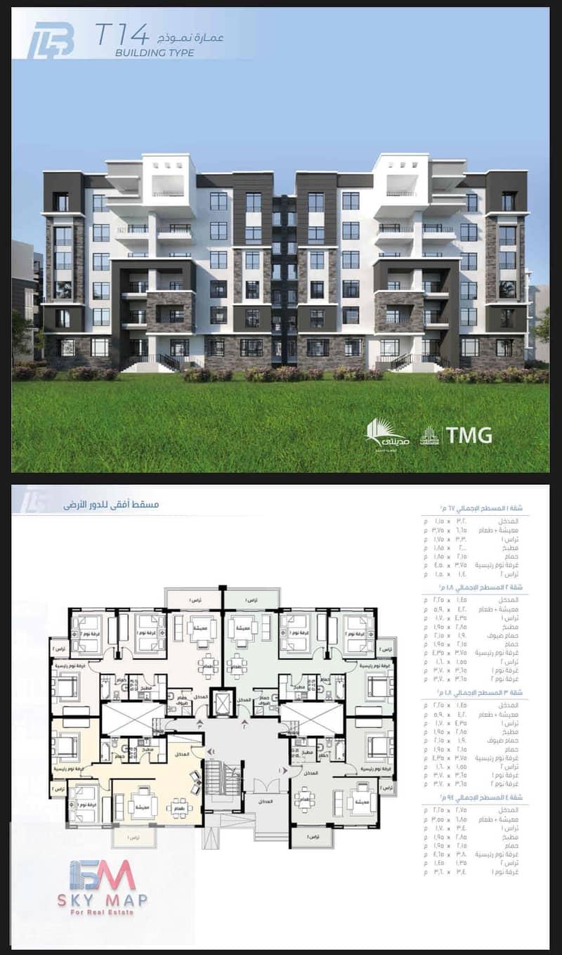 Apartment for sale in installments in Madinaty, 108 m + 55 m ground floor garden in B14 with a wide garden view facing services, old reservation.