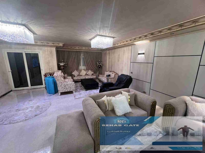 Furnished apartment for rent in Al Rehab, ground floor with a garden