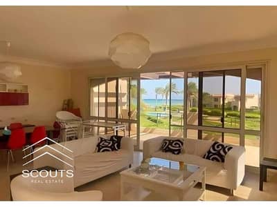 On the sea, a chalet for sale in Ain Sokhna (ground floor + garden), immediate delivery, super lux finishing, prime location, unobstructed sea view, A