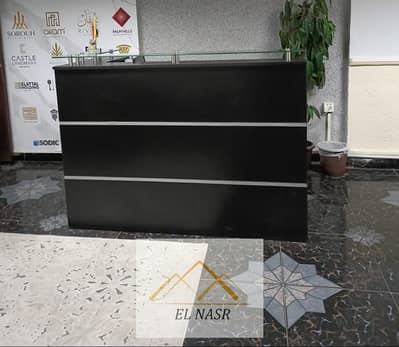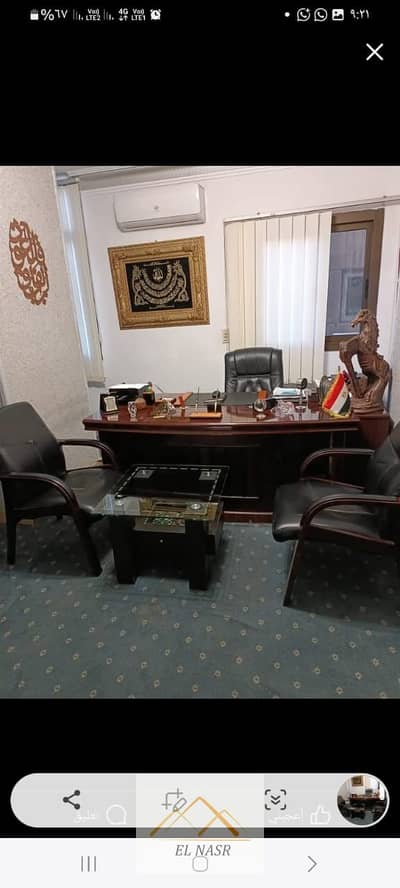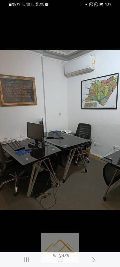 Furnished and air-conditioned office for rent on Abbas El Akkad Street, Nasr City. 3 bedrooms, spacious reception, super-lux ceramic floors, natural gas, telephone, and internet. Furnished with upscale office furniture, 4 air conditioners, computers, surveillance cameras, fingerprint device, printer, screens, curtains, a library, meeting room, and equipped kitchen. Code d345. Contact