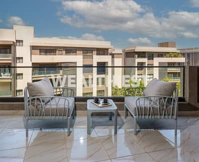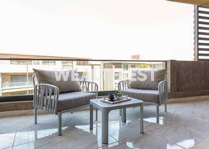 For rent: luxurious hotel apartment, first occupancy in the latest and most upscale phases of Madinaty – B15. Area: 142 m². Number of rooms: 3 bedrooms (master + dressing) – Number of bathrooms: 2. Terrace.