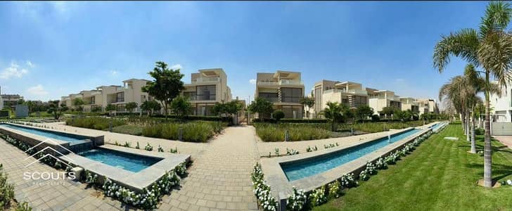 Standalone villa with a prime location overlooking a landscaped area, close to all amenities in New Cairo.