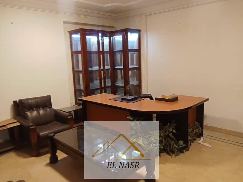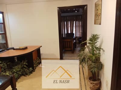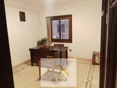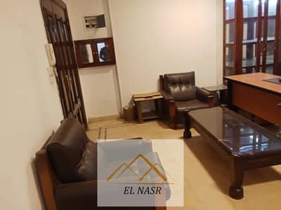 Luxury furnished and air-conditioned office for rent at the intersection of Makram Abid and Mustafa El-Nahas, Nasr City. 3 rooms, reception, 2 pieces, and a balcony. Super Lux finishing, ceramic floors, including 2 air conditioners and a fitted wooden kitchen. Attractive rent. Brokers are not allowed.
