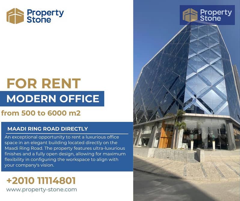 An exceptional opportunity to rent a prestigious office space within a stylish building in a prime administrative complex on the Maadi Ring Road. The location boasts super deluxe finishes and spacious, fully open-plan areas, offering complete flexibility to design your company headquarters to perfectly suit your vision.