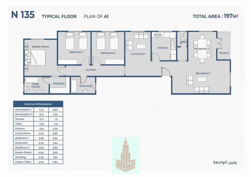 The apartment has a total area of one hundred ninety-seven square meters and consists of three bedrooms and three bathrooms, in addition to two spacious reception areas that allow an ideal separation between living and dining spaces. The unit also features a terrace providing good natural ventilation and open views, as well as a practical kitchen ready to be customized according to personal preferences. The apartment is delivered in semi-finished condition without furniture, giving the buyer full flexibility in final finishing and interior design.
